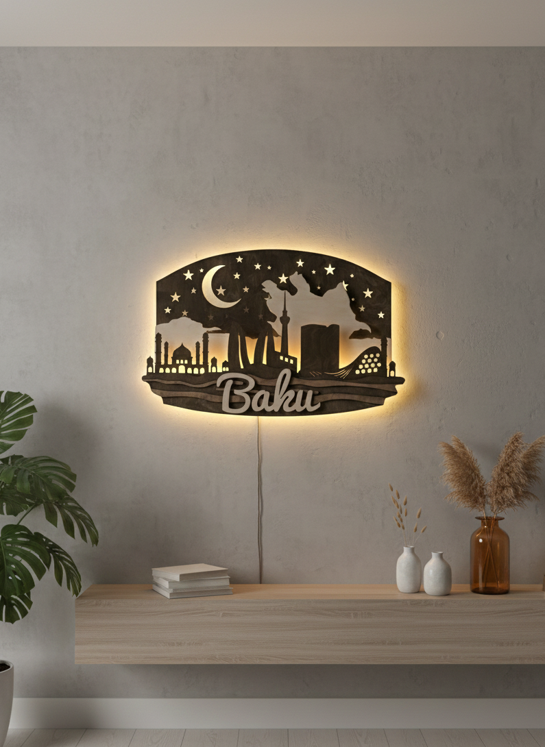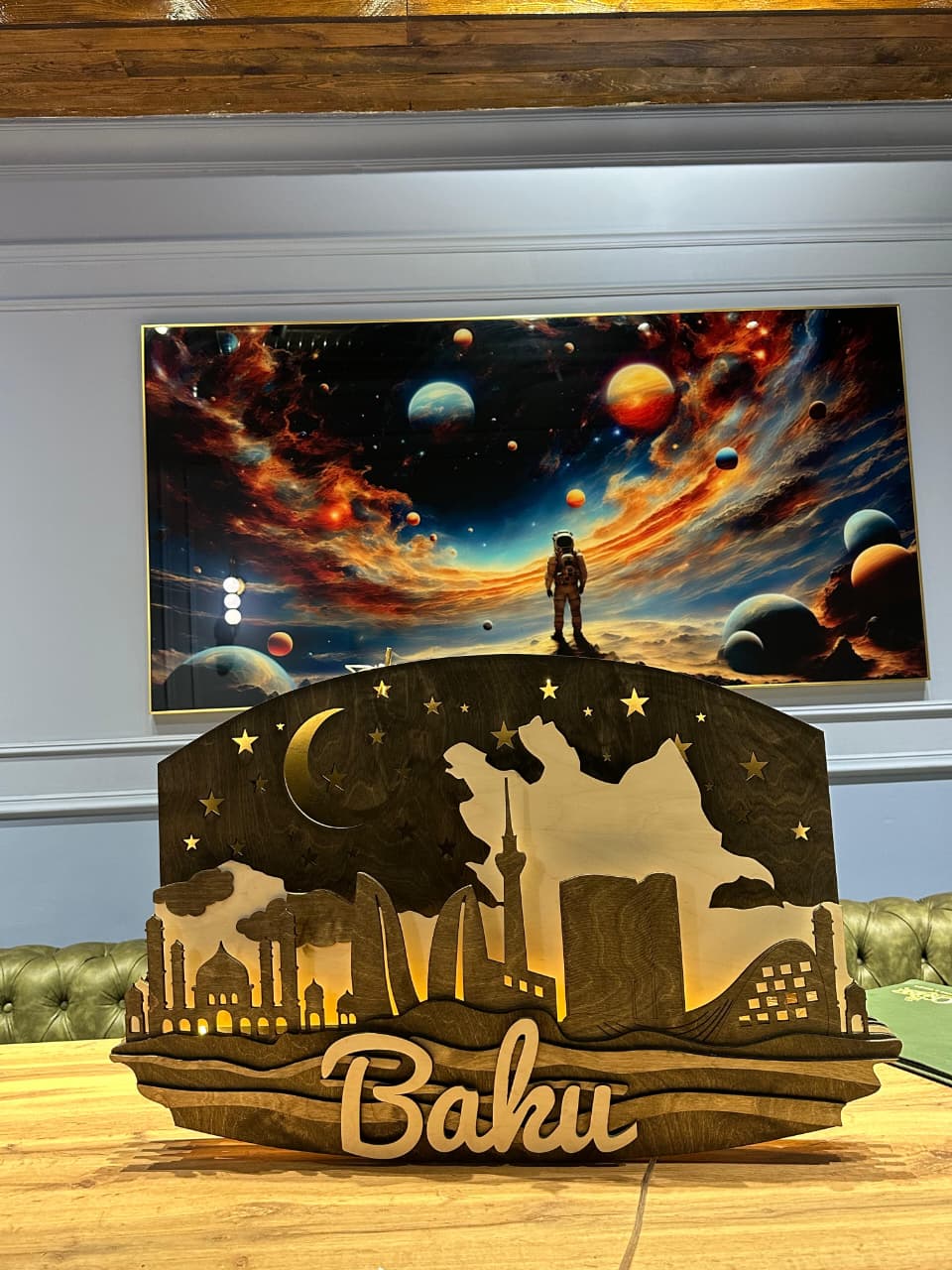 Bu əsər Bakının ruhunu və gecənin sehrini bir araya gətirir. Ay, ulduzlar və şəhərin silueti birlikdə sakitlik və ilham hissi yaradır. Taxta üzərində işlənmiş detallı dizayn həm milli dəyərləri, həm də müasir Bakının gözəlliyini əks etdirir. Ev və ya ofis üçün fərqli, mənalı və isti bir dekor seçimidir.