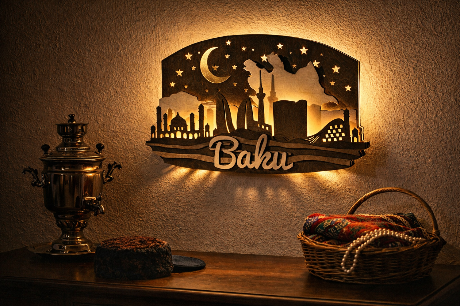 Bu əsər Bakının ruhunu və gecənin sehrini bir araya gətirir. Ay, ulduzlar və şəhərin silueti birlikdə sakitlik və ilham hissi yaradır. Taxta üzərində işlənmiş detallı dizayn həm milli dəyərləri, həm də müasir Bakının gözəlliyini əks etdirir. Ev və ya ofis üçün fərqli, mənalı və isti bir dekor seçimidir.